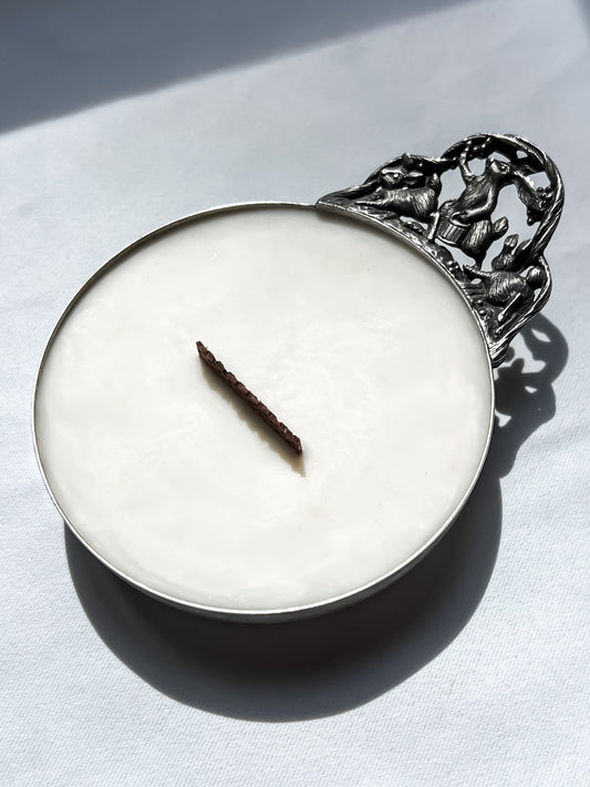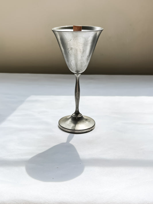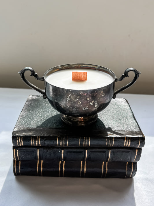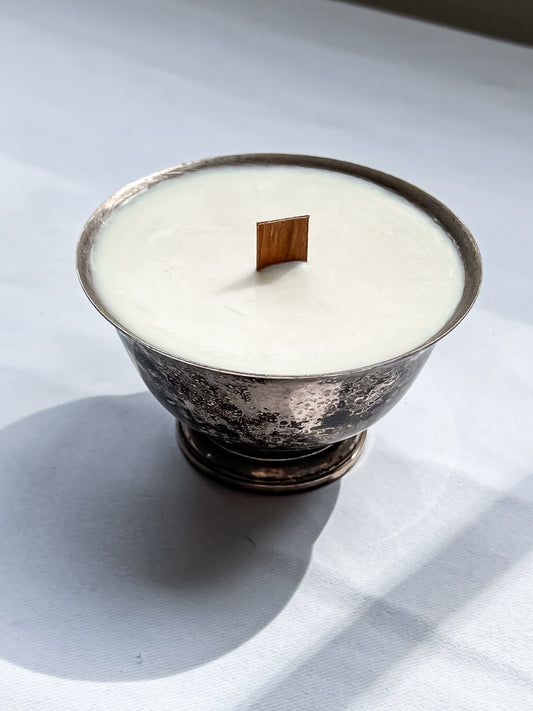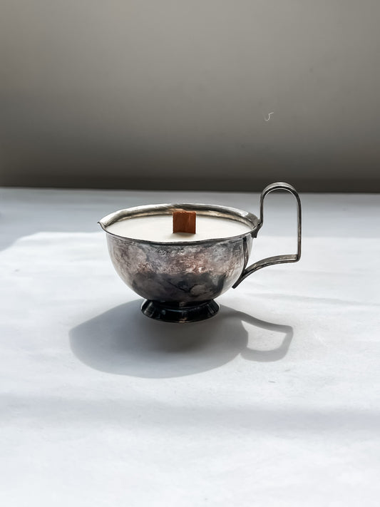 A luxurious curation of silver and brass vintage vessels, turned into warm, glowing candle art.
