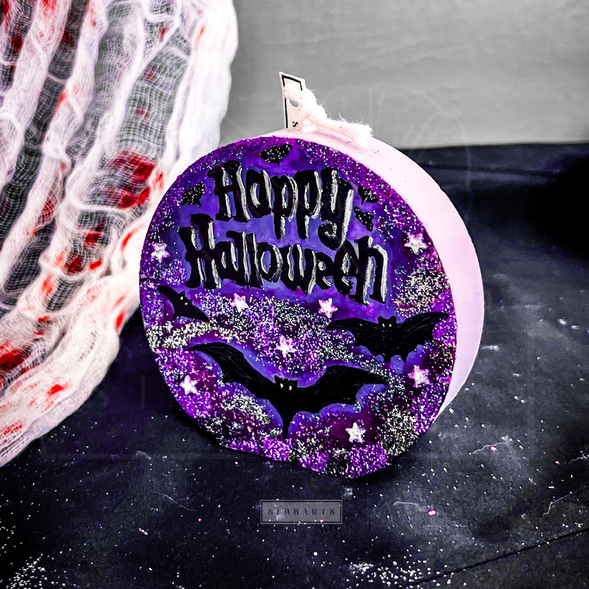 Handcrafted ‘Happy Halloween’ circles pillar candle .