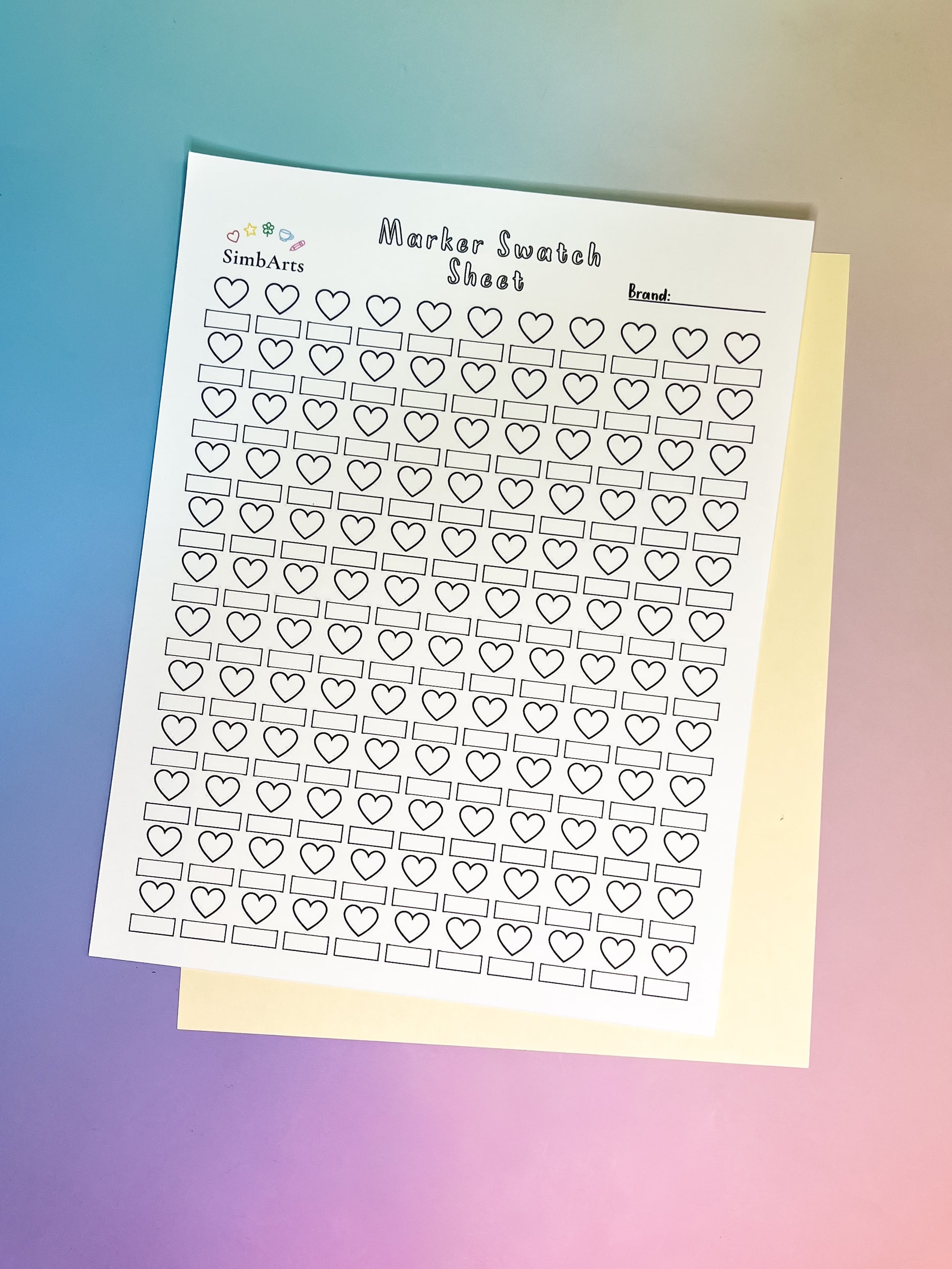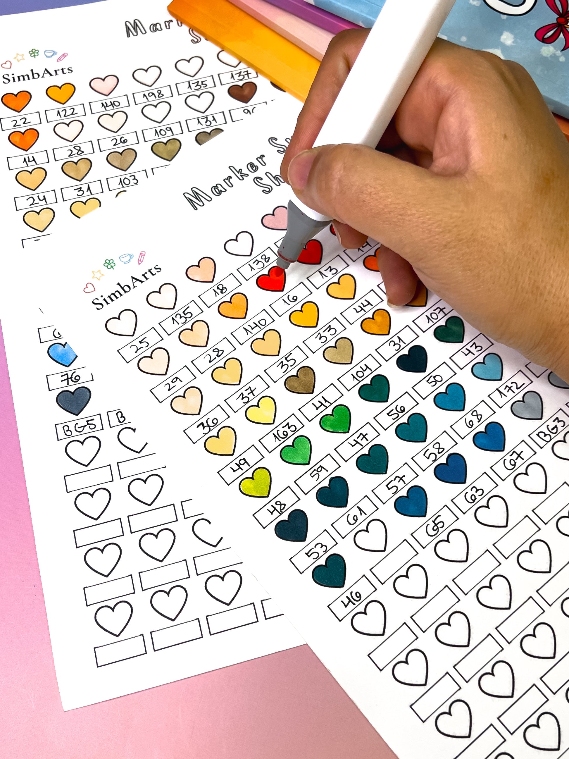 Designed with clean, aesthetic heart-shaped swatch boxes, this sheet helps you test and record all your marker shades in the most satisfying way. Perfect for alcohol markers, water-based markers, brush pens, and gel pens.