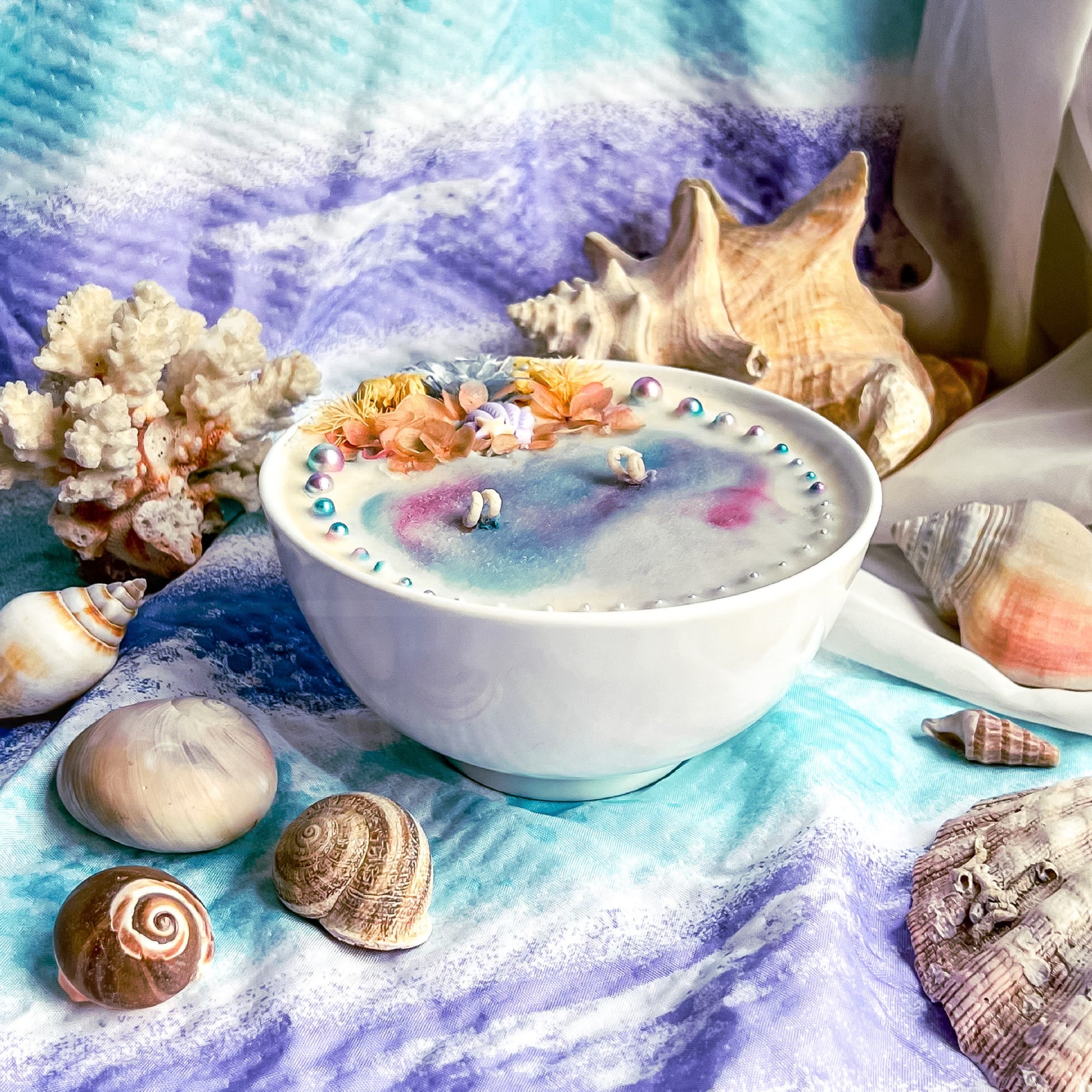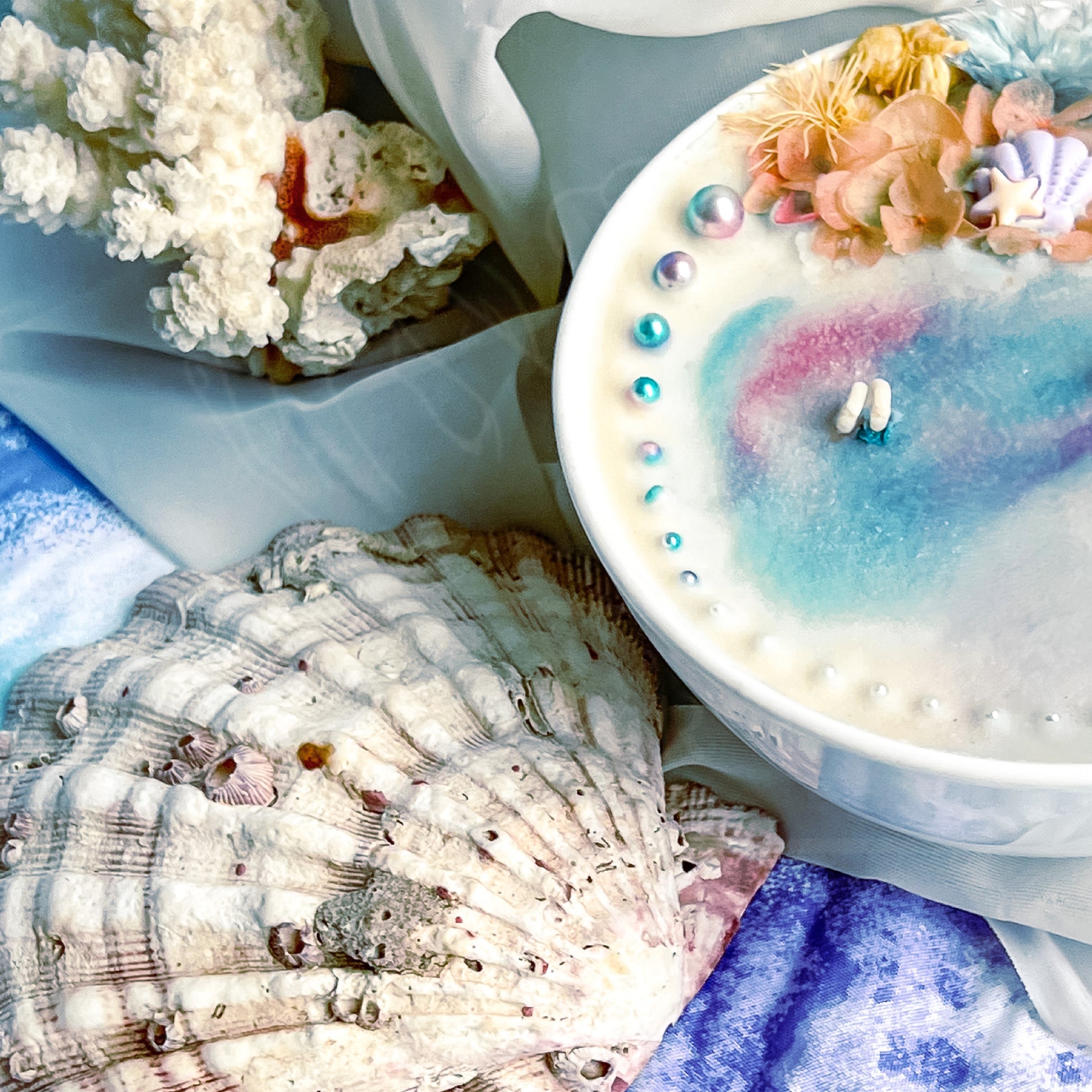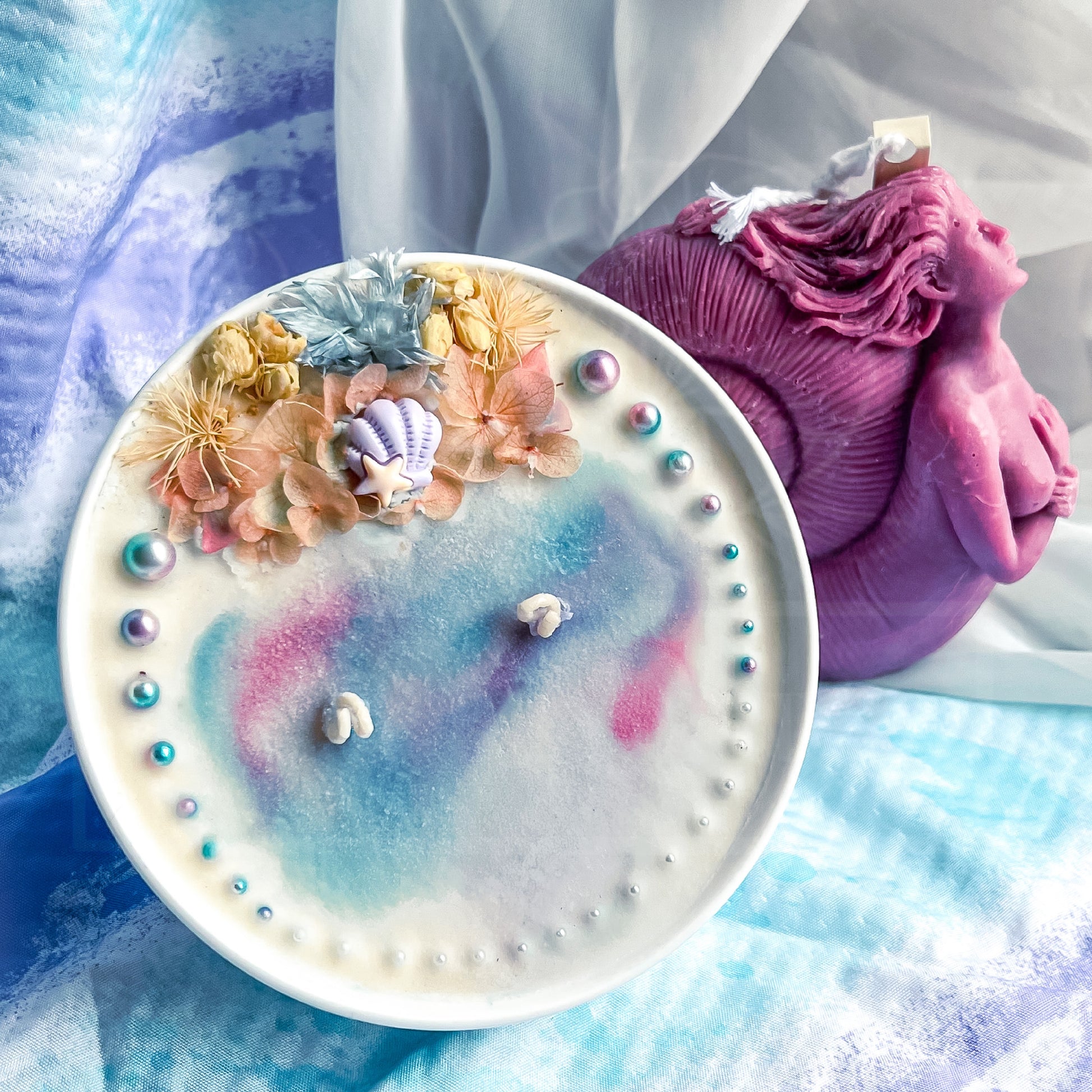 The candle comes in a beautiful blue and pink color palate that mimics the colors of the ocean. The soft hues and intricate design of the candle are inspired by beautiful seashells, bubbles, and a blooming flower reef, which add a touch of elegance to any room.